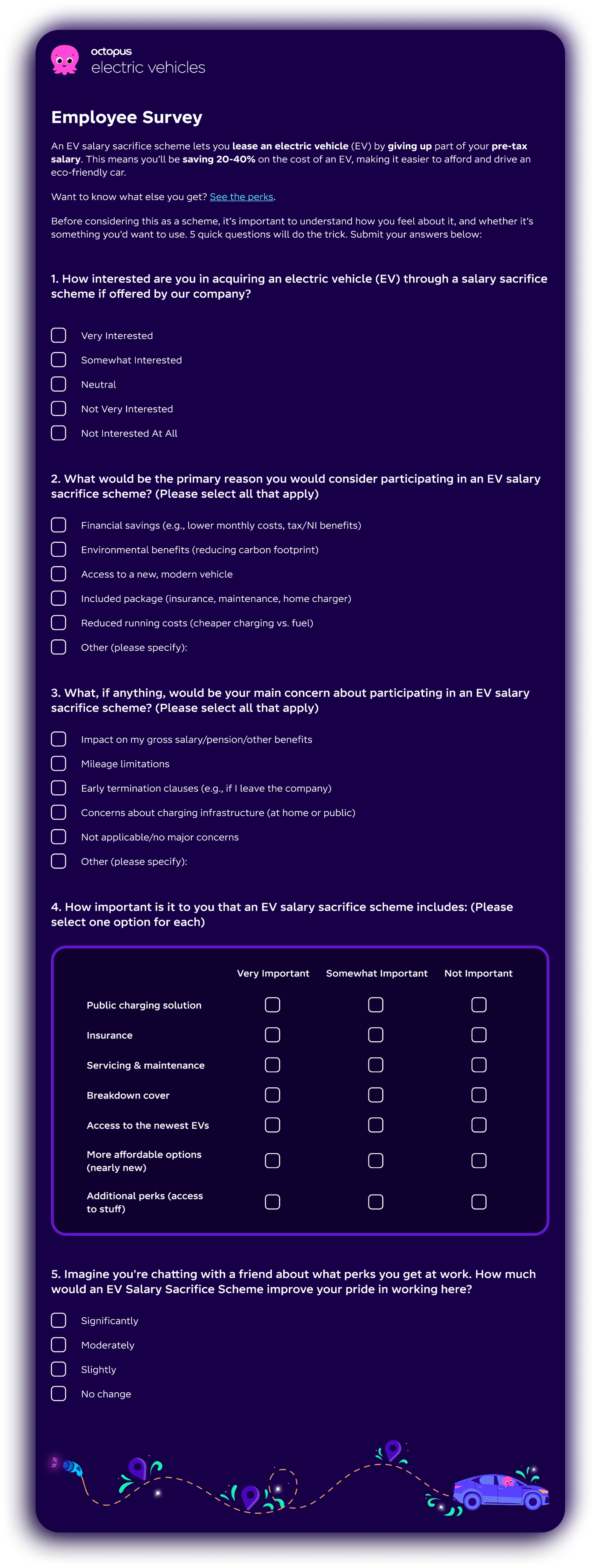 We’re so confident that your employees will love it, we've created a simple survey to prove just how much they want an EV salary sacrifice scheme.